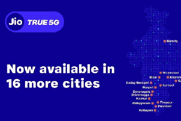 Mumbai, 17th January 2023: Reliance Jio today announced the launch of its True 5G services across 16 cities namely Kakinada, Kurnool (Andhra Pradesh), Silchar (Assam), Davanagere, Shivamogga, Bidar, Hospet, Gadag-Betageri (Karnataka), Malappuram, Palakkad, Kottayam, Kannur (Kerala), Tiruppur (Tamil Nadu), Nizamabad, Khammam (Telangana), and Bareilly (Uttar Pradesh).