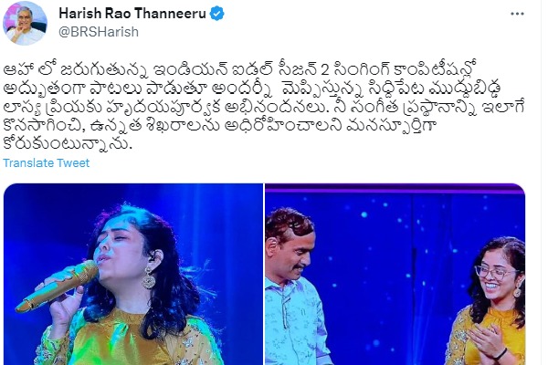వీరందరి లిస్టులోకి తాజాగా ఎంట్రీ ఇచ్చారు తెలంగాణ ఆర్థిక శాఖ మంత్రి హరీష్‌ రావు. ఇటీవల ఆయన తన ట్విట్టర్‌ ఖాతాలో ఈ విషయాన్ని ప్రస్తావించారు. ఆహా తెలుగు ఇండియన్‌ ఐడల్‌2లో పార్టిసిపేట్‌ చేసే లాస్యప్రియ ప్రతిభ గురించి రాశారు. ‘తెలుగు ఇండియన్‌ ఐడల్‌ 2’లో అత్యంత ప్రతిభను చూడటం  చాలా ఆనందంగా అనిపించింది. లాస్యప్రియ గళం నా చెవుల్లో మారుమోగుతోంది. ఆమె భవిష్యత్‌ ప్రణాళికలన్నీ సఫలం కావాలని ఆకాంక్షిస్తున్నాను'' అని ట్వీట్‌ చేశారు హరీష్‌ రావు.