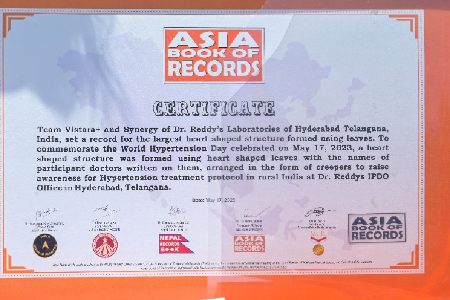 డాక్టర్ రెడ్డీస్ క్లస్టర్ హెడ్ (వాణిజ్య కార్యకలాపాలు) ఆదిత్య వశిష్టకు “ఆకులను ఉపయోగించి రూపొందించిన అతిపెద్ద గుండె ఆకారపు నిర్మాణం” సైటేషన్ సర్టిఫికెట్‌ను ఆసియా బుక్ ఆఫ్ రికార్డ్స్న్యా యనిర్ణేత రామ్ మోహన్ రెడ్డి అందజేశారు. ధృవీకరించబడిన ఇన్‌స్టాలేషన్‌లో వైద్యుల పేర్లు మరియు వారి అవగాహన సందేశాలు ఉన్నాయి: ‘మీ బీపీని కొలవండి - సరైన రోగ నిర్ధారణ మరియు సరైన చికిత్స’; ‘దీన్ని నియంత్రించండి - మందుల వాంఛనీయ వినియోగం’; మరియు ‘లివ్ లాంగర్ -సరైన కౌన్సెలింగ్ మరియు రోగులకు కట్టుబడి ఉండేలా చేయడం’ తదితర నినాదాలు అందులో ఉన్నాయి. ఇందులో పాల్గొన్న వైద్యులందరూ డాక్టర్ రెడ్డీస్ నుంచా ‘ఆసియా బుక్ ఆఫ్ రికార్డ్స్’ ప్రమాణ పత్రాన్ని అందుకున్నారు. సంస్థ తన ఆవరణలో ఒక ఏడాది పాటు పాటు ఈ ఇన్‌స్టాలేషన్‌ను ఉంచాలని లక్ష్యంగా పెట్టుకుంది.