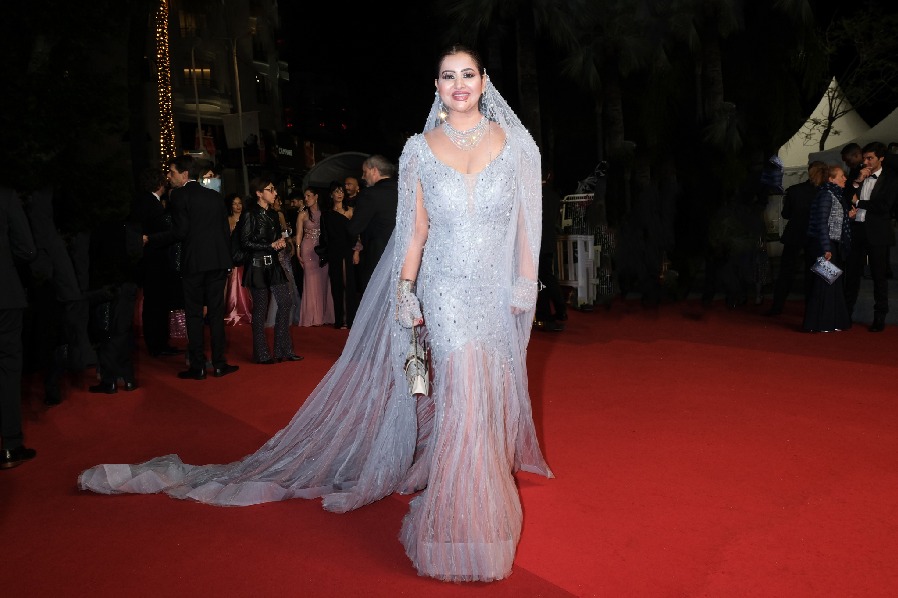 For her debut red-carpet walk for the premiere of Les Filles D'Olfa she wore a couture Neeta Lulla silverish-grey body-fitting evening gown. The dreamy fairy-tale ensemble consisted of intricate embroidery and sequins with a head trail. Her Valentino shoulder bag in crystal metallic sunshine and antique brass coupled with Harry Winston Secret Combination Diamond Necklace weighing a total of approximately 115.90 carats, set in platinum added the extra glitz to her outing. Her subtle make-up and tied back hairstyle spotlighted her aesthetic look.