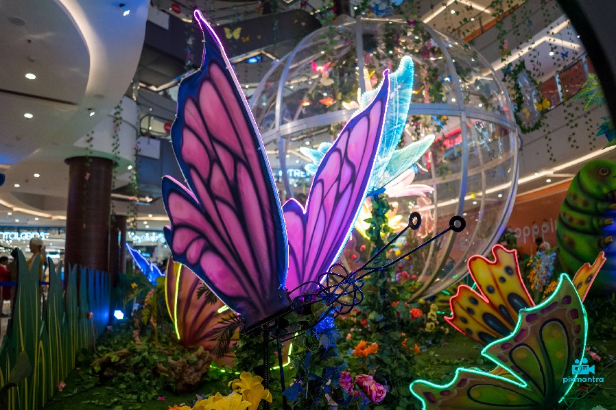పర్యావరణం పట్ల వారి నిబద్ధతలో భాగంగా, సత్త్వ నెక్లెస్ మాల్ అనుసంధానిత మరియు అనుభవపూర్వక డెకర్ను అందిస్తుంది. సీలింగ్ కాస్ట్స్ నుండి వేలాడదీసిన , మంత్రముగ్ధులను చేసే భూగోళం ఆహ్లాదకరమైన మెరుపును ప్రసరిస్తుంది మరియు ప్రవేశించిన క్షణం నుండి దృష్టిని ఆకర్షిస్తుంది, మరియు తొలిచూపు లోనే మరుపురాని అభిప్రాయాన్ని సృష్టిస్తుంది. కస్టమర్లు అట్రియం ను బ్రౌజ్ చేస్తున్నప్పుడు, వారు దాని స్పష్టమైన రంగులు మరియు క్లిష్టమైన వివరాలతో స్తంభాల చుట్టూ తిరిగే అపారమైన గొంగళి పురుగు వైపుకు ఆకర్షితులవుతారు. ఏది ఏమైనప్పటికీ, నిజమైన అద్భుతం ఏమిటంటే, దాని సున్నితమైన రెక్కలు వెడల్పుగా విస్తరించి, సంగీతానికి అనుగుణంగా నృత్యం చేసే వివిధ రకాల మెరుస్తున్న లైట్లతో అలంకరించబడిన ఒక భారీ సీతాకోకచిలుక. కాంతి మరియు ధ్వని పరస్పర చర్య ద్వారా ఆట్రియం ఒక మాయా ప్రపంచంగా రూపాంతరం చెందింది, ప్రవేశించే ప్రతి ఒక్కరినీ ఆకర్షిస్తుంది.