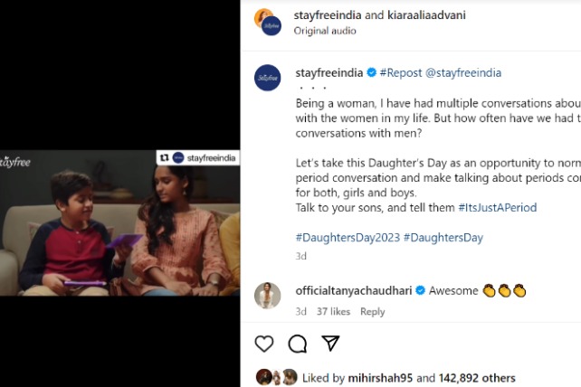 Mumbai, 29 September 2023: To mark Daughter’s Day, Stayfree®, one of India's leading brands in menstrual hygiene, along with its Brand Ambassadors, Kiara Advani, and PV Sindhu are championing the importance of parents talking to their sons about periods. Kiara Avani, India’s leading actress and PV Sindhu, Badminton World Champion took to social media to encourage their followers, especially parents to talk to their sons from a young age about menstruation and encourage open conversations around periods.