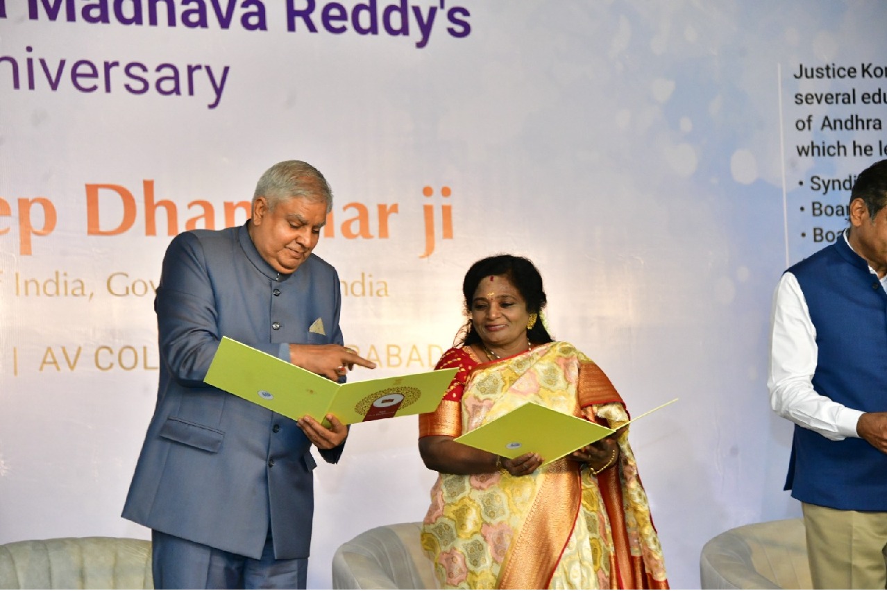 Hon’ble Governor of Telangana and Lt. Governor of Puducherry, Dr. Tamilisai Soundararajan, accompanied the Hon’ble Vice President of India, Shri Jagdeep Dhankhar ji, and participated in the “Postal Cover release function on the occasion of 100 th Birth Anniversary of Late Justice Konda Madhava Reddy” at A.V. College, Gagan Mahal, Hyderabad, today (27.12.2023)