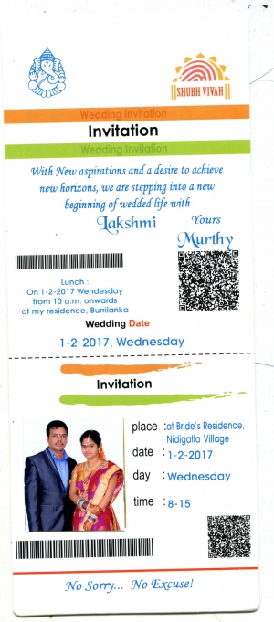 ఓ వినూత్న ఆలోచన వస్తే, అది ఎంతగా చొచ్చుకుపోతుందో ఉదాహరణ ఈ వెడ్డింగ్ ఇన్విటేషన్ ఉదంతం. దేశమంతా ఆధార్ కార్డు ఆధారిత నగదురహిత చెల్లింపుల దిశగా కదులుతున్న వేళ, తన పెళ్లి శుభలేఖను సైతం ఆధార్ కార్డు మాదిరిగా తయారు చేయించి అందరినీ ఆశ్చర్యపరిచాడో యువ న్యాయవాది. తూర్పు గోదావరి జిల్లా కడియం మండలం బుర్రిలంకకు చెందిన కొత్తపల్లి మూర్తి వివాహం, లక్ష్మితో ఫిబ్రవరి 1న జరగనుంది. ఇక శుభలేఖను అచ్చు ఆధార్ కార్డు మాదిరిగా తయారు చేయించాడు మూర్తి. బార్ కోడ్, ఓఆర్ కోడ్ లు పెట్టించాడు. భారత త్రివర్ణ పతాకంలోని మూడు రంగులపై ఆహ్వానాన్ని ముద్రించాడు. తనక్కాబోయే శ్రీమతితో ఉన్న చిత్రాన్ని కార్డులో ఫోటో ఉండే స్థానంలో ఉంచాడు. ఇప్పుడీ శుభలేఖ గోదావరి జిల్లాలో ఓ టాపిక్ గా మారింది. పలువురు కొత్తపల్లి మూర్తి ఆలోచనను మెచ్చుకుంటున్నారు. ఆ వినూత్న వెడ్డింగ్ కార్డు ఇదే!