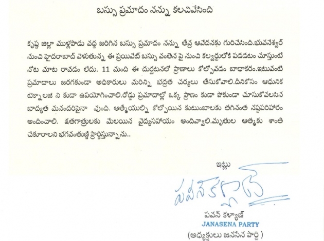 కృష్ణా జిల్లా ముళ్లపాడు వద్ద జరిగిన బస్సు ప్రమాదం తనని కలచివేసిందని జనసేన అధినేత, సినీనటుడు పవన్ కల్యాణ్ ఈ రోజు విడుదల చేసిన ప్రెస్నోట్లో పేర్కొన్నారు. ఆ పత్రికా ప్రకటనను పైన యథాతథంగా ప్రచురించాం.