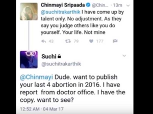 తన ట్వీట్లతో దక్షిణాది సినీ పరిశ్రమలో సంచలనం కలిగిస్తున్న గాయని సుచిత్రా కార్తీక్, ఈ సారి మరో గాయని చిన్మయీ శ్రీపాదపై పడింది. ఆమెను టార్గెట్ చేసుకుని సుచిత్ర సంచలన వ్యాఖ్యలు చేసింది. "2016లో నువ్వు చేయించుకున్న నాలుగు అబార్షన్ల వివరాలను వెల్లడించాలా? డాక్టర్ల రిపోర్టులు నాకు తెలుసు. నా దగ్గర వాటి కాపీలు ఉన్నాయి. నీకు చూడాలని ఉందా?" అని ప్రశ్నించింది. అంతకుముందు తనను టార్గెట్ చేసుకుని సుచిత్ర చేస్తున్న ట్వీట్లపై చిన్మయి స్పందిస్తూ, తాను కేవలం టాలెంటుతోనే ఇండస్ట్రీలో పైకి వచ్చానని, ఎక్కడా అడ్జస్ట్ మెంట్ కాలేదని చెప్పుకొచ్చింది. సుచిత్ర తన జీవితాన్ని గడుపుతున్నట్టుగానే ఇతరులూ ఉన్నారని అనుకొంటోందని విమర్శించింది. కాగా, వివిధ వర్గాల నుంచి వస్తున్న ఫిర్యాదుల మేరకు ట్విట్టర్ యాజమాన్యం సుచిత్ర ఖాతాలను సస్పెన్షన్ లో ఉంచింది.