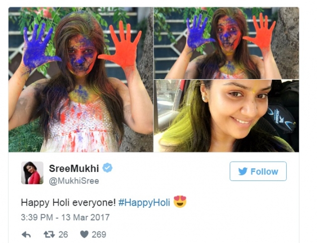హోలీ రంగులతో టీవీ యాంకర్, సినీ నటి శ్రీముఖి ముఖం నిండిపోయింది. క్రికెటర్లు, రాజకీయ నాయకులు, వెండితెర, బుల్లితెర ప్రముఖులు తాము జరుపుకుంటున్న హోలీ సంబరాల ఫొటోలను సోషల్ మీడియాలో పోస్టు చేస్తున్నారు. మరి సోషల్ మీడియాలో యాక్టివ్గా ఉండే శ్రీముఖి వదులుతుందా? తన ట్విట్టర్లో ఖాతాలో ఆమె తీసుకున్న కొన్ని ఫొటోలను పోస్ట్ చేసింది. ముఖం నిండా హోలీ రంగులతో ఎవ్వరూ గుర్తుపట్టలేని విధంగా ఉంది. మొత్తం మూడు ఫొటోలను ఈ అమ్మడు ట్విట్టర్లో ఉంచగా, వాటిలో రెండు రంగు రంగుల ముఖాలే ఉన్నాయి. అందులోని ఓ ఫొటో మాత్రం ఆమె చక్కగా ముఖం కడుక్కున్నాక తీసిన ఫొటోలా ఉంది. అందరికీ హ్యాపీ హోలీ అని ఆమె పేర్కొంది. బుల్లితెరపై చకచకా మాట్లాడుతూ, తన అందంతో కట్టిపడేస్తోన్న శ్రీముఖికి సోషల్ మీడియాలో ఫాలోవర్లు ఎక్కువే.