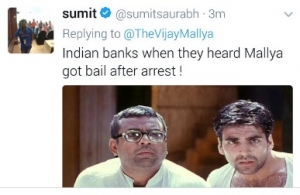 విజయ్ మాల్యా ఒకప్పుడు రాయల్ చాలెంజర్స్ బెంగళూరు జట్టుకు యజమాని అన్న విషయం తెలిసిందే. దీంతో ఆర్సీబీ జట్టు పెర్ఫార్మెన్సు ఇక్కడే కాదు, లండన్లో కూడా బాగోలేదని కొందరు సెటైర్లు వేస్తున్నారు. ఇక దర్శకుడు శిరీష్ కుందర్ తమ ట్విట్టర్ ఖాతా ద్వారా ఇదే అంశంపై స్పందిస్తూ... 'బ్యాంక్ చోర్' సినిమా ప్రమోషన్ కోసమే విజయ్ మాల్యాను లండన్నుంచి తీసుకొస్తున్నారని పేర్కొన్నాడు. ఇలా ఒకటి, రెండు కాదు.. మాల్యాపై సెటైర్ వేయడానికి ప్రపంచంలోని అన్ని అంశాలను వాడేసుకుంటున్నారు. అందులో కొన్నింటిని మీరూ చూడండి...