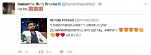 టాలీవుడ్ యంగ్ హీరో నాగచైతన్య, నటి రకుల్ ప్రీత్ సింగ్ నటించిన ‘రారండోయ్ వేడుక చూద్దాం’ సినిమా రేపు విడుదల కానున్న విషయం తెలిసిందే. ఈ చిత్రం ప్రచారంలో భాగంగా ఆ సినిమా యూనిట్ ప్రచార కార్యక్రమాల్లో జోరుగా పాల్గొంటోంది. ఓ టీవీ ఛానెల్ ప్రోగ్రామ్లో పాల్గొన్న నాగచైతన్య, రకుల్ ప్రీత్ సింగ్ సరదాగా మాట్లాడుకొని ప్రేక్షకులను అలరించారు. కాగా, ప్రోగ్రాం మధ్యలో యాంకర్.. నాగచైతన్యతో సమంతకు ఫోన్ చేయించి, ఓ విషయాన్ని అడిగించాడు. 'ప్రపంచంలో ఇంత మంది అమ్మాయిలు ఉండగా నేను సమంతనే ఎందుకు లవ్ చేశాను?' అంటూ నాగచైతన్య సమంతను అడిగాడు. అందుకు సమంత సమాధానం చెబుతూ ‘నేను నీకు ఆ ఆప్షన్ ఇవ్వలేదు కాబట్టి’ అని చెప్పింది. దీంతో చైతు 'సరే నాకు ఇంకో ఆప్షన్ వద్దులే' అని అన్నాడు. తర్వాత సమంత ఐలవ్యూ అని చెప్పింది. సమంత ఇందుకు సంబంధించిన వీడియోను తన ట్విటర్ ఖాతాలో పోస్ట్ చేసి హా..హా..హా అని పేర్కొంది.