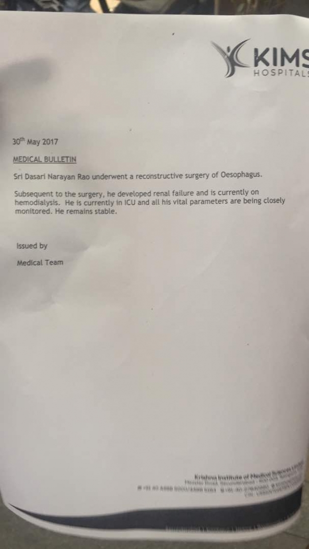 ప్రముఖ దర్శకుడు దాసరి నారాయణ రావు తీవ్ర అస్వస్థతకు గురై హైదరాబాద్ లోని కిమ్స్ ఆసుపత్రిలో చికిత్స తీసుకుంటున్న విషయం తెలిసిందే. దాసరి ఆరోగ్యంపై కిమ్స్ ఆసుపత్రి వైద్యులు హెల్త్ బులిటెన్ విడుదల చేశారు. దాసరి ప్రస్తుతం ఐసీయూలో ఉన్నారని, ఆయనకు హిమో డయాలసిస్ అందిస్తున్నామని తెలిపారు. దాసరి ప్రధాన అవయవాల పనితీరుని పరిశీలిస్తున్నామని తెలిపారు. ఆయన ఆరోగ్యం నిలకడగానే ఉందని తెలిపారు. అన్నవాహిక దెబ్బతినడంతో గొంతు నుంచి జీర్ణాశయం వరకు చికిత్స అందించామని తెలిపారు.