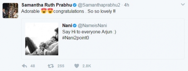 సహజ నటుడిగా గుర్తింపు తెచ్చుకున్న హీరో నాని ఇటీవలే తన బుల్లి కుమారుడు అర్జున్తో కలిసి దిగిన ఓ ఫొటోను పోస్ట్ చేసిన సంగతి తెలిసిందే. తన కుమారుడిని ప్రేమగా తన గుండెలపై పడుకోబెట్టుకుని, ముద్దాడుతూ హీరో నాని పోస్ట్ చేసిన ఆ ఫొటో నాని అభిమానులతో పాటు చెన్నై బ్యూటీ సమంతను కూడా విశేషంగా ఆకట్టుకుంది. 'సో సో లవ్లీ' అని పేర్కొంటూ నానికి సమంత శుభాకాంక్షలు తెలిపి, నాని పోస్ట్ ను షేర్ చేసింది. ‘అందరికీ హాయ్ చెప్పు అర్జున్’ అని నాని ఆ ఫొటోలో పేర్కొంటూ ఈ విధంగా తన కుమారుడి పేరు అర్జున్ అని తెలియజేసిన విషయం తెలిసిందే.