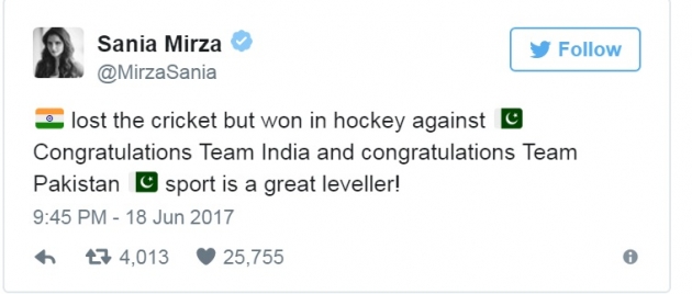 ఐసీసీ ఛాంపియ‌న్స్ ట్రోఫీ ఫైన‌ల్ మ్యాచ్‌లో పాకిస్థాన్ చేతిలో భార‌త్ ఓడిపోయిన విష‌యం తెలిసిందే. ఈ విష‌యంపై స్పందించిన భార‌త‌ టెన్నిస్ స్టార్, పాక్ క్రికెట‌ర్ షోయ‌బ్ మాలిక్ భార్య‌ సానియా మీర్జా  ట్వీట్ చేస్తూ... ఫైన‌ల్ మ్యాచ్‌లో భార‌త్ ఓడిపోయింది.. అదే రోజు హాకీలో ఇండియా చేతిలో పాక్ ఓడిపోయింది. భార‌త్‌ క్రికెట్‌లో ఓడి హాకీలో గెలిచింది' అంటూ త‌న ట్విట్ట‌ర్ ఖాతాలో పేర్కొంది. 'కంగ్రాట్స్ ఇండియా, కంగ్రాట్స్ పాకిస్థాన్' అని పేర్కొంటూ స్పోర్ట్స్ లెక్క స‌మం అయింద‌ని ఆమె చెప్పింది. సానియా చేసిన ఈ ట్వీట్‌పై అభిమానులు ర‌క‌ర‌కాలుగా కామెంట్లు చేస్తున్నారు.