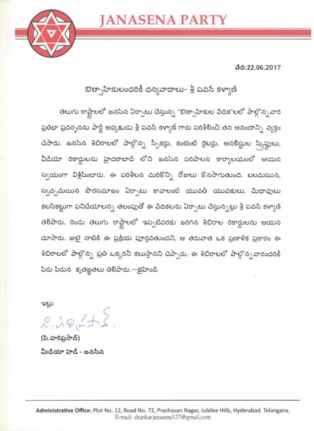: శిబిరాల్లో పాల్గొన్న ప్రతి ఒక్క‌రినీ ప‌వ‌న్ క‌ల్యాణ్ క‌లుస్తారు: జ‌న‌సేన ప్రెస్ నోట్
