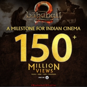 టాలీవుడ్ యువ న‌టులు ప్ర‌భాస్‌, రానాలు ప్ర‌ధాన‌పాత్ర‌ల్లో ద‌ర్శ‌క‌ధీరుడు రాజ‌మౌళి తెర‌కెక్కించిన బాహుబ‌లి-2 బాక్సాఫీస్ వ‌ద్ద కాసుల సునామీ సృష్టిస్తోన్న విష‌యం తెలిసిందే. ఈ సినిమా విడుద‌ల‌కు ముందు యూ ట్యూబ్‌లో ఉంచిన ట్రైల‌ర్ మొద‌టి రోజు నుంచే అత్య‌ధిక వ్యూస్ సాధిస్తూ దూసుకుపోతోంది. ఈ రోజు ఈ ట్రైల‌ర్ 150 మిలియ‌న్ల వ్యూస్ దాటేసింద‌ని బాహుబ‌లి-2 టీమ్ త‌మ అధికారిక ట్విట్ట‌ర్ ఖాతా ద్వారా తెలిపింది.