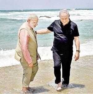 నరేంద్ర మోదీ భారత ప్రధాని, నెతన్యాహూ ఇజ్రాయెల్ ప్రధాని. ఈ ఇద్దరూ కలిసి సముద్ర తీరానికి వెళ్లిన వేళ, తమ హోదాలను పక్కనబెట్టి, చిన్నపిల్లల్లా మారిపోయారు. కాళ్లకు చెప్పుల్లేకుండా సముద్ర తీరంలో కాసేపు సరదాగా విహరించారు. మోదీ తన ప్యాంటు తడవకుండా పైకెత్తి పట్టుకుని మరీ నీటిలో ఉత్సాహంగా అడుగులు వేశారు. వారిద్దరూ ఆత్మీయంగా మాట్లాడుకుంటూ నెమ్మదిగా అడుగులు వేస్తూ వెళుతుంటే, దూరంగా ఉన్న కెమెరాలు క్లిక్ ల మీద క్లిక్ లు కొట్టాయి.