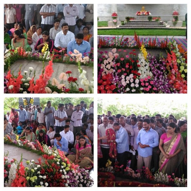 మాజీ ముఖ్యమంత్రి వైయస్ రాజశేఖరరెడ్డి 68వ జయంతి నేడు. ఈ సందర్భంగా కడప జిల్లా ఇడుపులపాయలో ఉన్న వైయస్ ఘాట్ వద్ద జగన్, విజయమ్మ, షర్మిల, భారతి, బ్రదర్ అనిల్ కుమార్, ఎంపీ వైయస్ అవినాష్ రెడ్డిలు ఘన నివాళి అర్పించారు. ప్రత్యేక ప్రార్థనలు నిర్వహించారు. ఈ సందర్భంగా వైయస్ విగ్రహానికి జగన్ పూలమాల వేసి, అంజలి ఘటించారు. ఈ సందర్భంగా అక్కడకు భారీ ఎత్తున అభిమానులు, కార్యకర్తలు వచ్చారు. వారందరినీ జగన్ ఆప్యాయంగా పలకరించారు.
