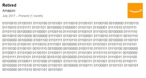 20 ఏళ్ల పాటు ఈ-కామర్స్ దిగ్గజం అమెజాన్లో పనిచేసి, ఇటీవలే రిటైరైన వైస్ ప్రెసిడెంట్ మైఖేల్ జార్జ్ తనదైన శైలిలో రిటైర్మెంట్ లెటర్ ను బైనరీ కోడ్ లో రాశారు. `20 ఏళ్ల తర్వాత అమెజాన్ నుంచి పదవీ విరమణ పొందా. అక్కడ పనిచేసిన ప్రతిక్షణం బాగుంది. అలాగని పూర్తిగా వెళ్లపోవట్లేదు, తీరు మారుతుందంతే!` అనే సమాచారాన్ని సున్నాలు, ఒకట్లను ఉపయోగిస్తూ బైనరీ కోడ్ లో రాశారు. ఈ లెటర్ను తన అధికారిక లింక్డిన్ అకౌంట్ ద్వారా పోస్ట్ చేశారు. అంతర్జాతీయ మార్కెట్లో అమెజాన్ వారి స్మార్ట్ స్పీకర్ను మార్కెటింగ్ చేయడంలో మైఖేల్ జార్జ్ ఎంతో కృషి చేశారు.