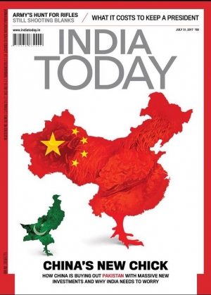 భారతదేశానికి చెందిన ప్రతిష్టాత్మక మేగజైన్ `ఇండియా టుడే` కవర్ ఫొటోపై చైనా సోషల్ మీడియా వైబోలో దుమారం చెలరేగుతోంది. ఈ కవర్ ఫొటోలో చైనా దేశ పటాన్ని పెద్ద కోడి రూపంలో చూపించి, దాని పక్కన పాకిస్థాన్ దేశ పటాన్ని చిన్న కోడి పిల్ల రూపంలో చూపించారు. ఇలా చూపించడంతో చైనా వాళ్లకు చిర్రెత్తిందనుకోవడం పొరపాటే, చైనీయులు కోపం వ్యక్తం చేసేది పాకిస్థాన్తో సంబంధాలను చూపించినందుకు కాదు... చైనా పటంలో టిబెట్, తైవాన్ దేశాలను చూపించనందుకు!
