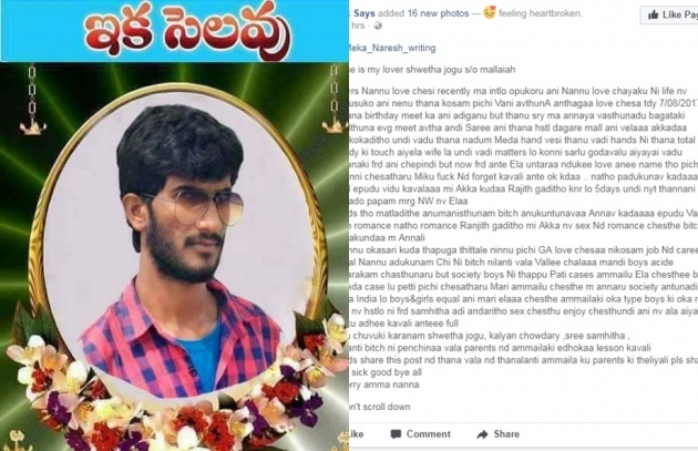 తమను వృద్ధాప్యంలో ఆదుకుంటాడని ఆశించిన ఆ తల్లిదండ్రుల ఆశలు అడియాసలయ్యాయి. ప్రేమించిన యువతి మోసం చేసిందని తెలుసుకున్న ఓ విద్యావంతుడు, ఇక తనకు భవిష్యత్ లేదని భావిస్తూ, ఆ అమ్మాయి బాగోతాన్ని బట్టబయలు చేసి మరీ రైలు కింద తలపెట్టి ఆత్మహత్య చేసుకున్న తీరు ప్రతి ఒక్కరినీ కలచి వేస్తోంది. తన ప్రియురాలితో దిగిన ఫోటోలను, తన ఆత్మహత్యకు గల కారణాలనూ ఫేస్ బుక్ లో పెట్టి మరీ ఈ యువకుడు ఆత్మహత్య చేసుకోగా, అదిప్పుడు వైరల్ అయింది. యువకుడిని మోసం చేసిన యువతి వైఖరిని వేల మంది విమర్శిస్తున్నారు.