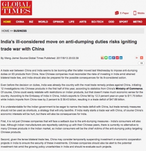 డోక్లాంలో ఉద్రిక్త పరిస్థితులు ఏర్పడ్డ నేపథ్యంలో భారత్పై ప్రతిరోజు విమర్శలు చేస్తోన్న చైనా అధికార పార్టీ పత్రిక ‘గ్లోబల్టైమ్స్’ తాజాగా ఇరుదేశాల వాణిజ్య సంబంధాలపై ఓ కథనం ప్రచురించింది. చైనా నుంచి దిగుమతయ్యే కొన్ని వస్తువులపై యాంటీ డంపింగ్ డ్యూటీలను విధించాలని యోచిస్తోన్న ఇండియాను హెచ్చరించే ప్రయత్నం చేసింది. తమ దేశానికి చెందిన పెట్టుబడిదారులు భారత్లో పెట్టుబడులు పెట్టేముందు ఈ అంశాన్ని పరిశీలించాలని తెలిపింది.