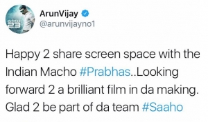 బాహుబలి 2 తర్వాత ప్రభాస్ నటిస్తున్న `సాహో` చిత్రానికి సంబంధించి కొత్తగా మరో అప్డేట్ తెలిసింది. ఈ చిత్రంలో తమిళ నటుడు అరుణ్ విజయ్ ఓ కీలక పాత్రలో నటిస్తున్నట్లు తెలుస్తోంది. ఈ విషయాన్ని స్వయంగా అరుణ్ విజయ్ ట్విట్టర్లో తెలియజేశారు. `ప్రభాస్తో స్క్రీన్ షేర్ చేసుకోనున్నందుకు ఆనందంగా ఉంది. `సాహో` బృందంలో భాగం అవుతున్నందుకు సంతోషంగా ఉంది` అని ఆయన ట్వీట్ చేశారు. ఇప్పటికే ఈ సినిమాలో బాలీవుడ్ నటి శ్రద్ధా కపూర్ హీరోయిన్గా నటిస్తున్న సంగతి తెలిసిందే. జాకీ ష్రాఫ్ కూడా ఈ సినిమాలో కీలక పాత్ర పోషిస్తున్నారు.