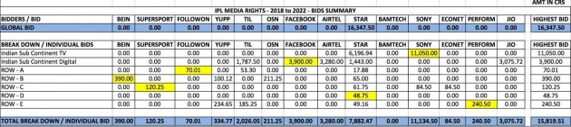 ఇండియన్ ప్రీమియర్ లీగ్ (ఐపీఎల్) ప్రసార హక్కుల కోసం 14 మీడియా సంస్థలు పోటీపడగా, వారిలో ఎక్కువగా రూ. 16,347.50 కోట్లు బిడ్ వేసి స్టార్ ఇండియా ప్రసార హక్కులను సొంతం చేసుకుంది. దీంతో 2018 నుంచి 2022 వరకు ఐదేళ్ల పాటు ఐపీఎల్కు సంబంధించిన మీడియా, డిజిటల్ కార్యక్రమాలను స్టార్ ఇండియా ప్రసారం చేసుకునే సౌకర్యం కలిగింది. భారత్లో డిజిటల్, ఇంటర్నెట్ మాధ్యమాల ద్వారా ప్రసారం కోసం ఎక్కువ బిడ్ వేసిన సంస్థలుగా రిలయన్స్ జియో, టైమ్స్ ఇంటర్నెట్, ఎయిర్టెల్, ఫేస్బుక్ నిలిచాయి. టీవీ ప్రసార హక్కుల కోసం సోనీ, స్టార్ ఇండియాలు అధికంగా బిడ్ చేశాయి. బిడ్లు వేసిన 14 కంపెనీల్లో బామ్టెక్, బెయిన్ స్పోర్ట్స్ సంస్థలను కొన్ని సంస్థాగత కారణాల వల్ల ఐపీఎల్ ప్రసారానికి అనర్హులుగా ప్రకటించారు.