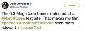 అలాగే ఇవాళ జాన్ అబ్రహం కూడా తన `పరమాణు: ద స్టోరీ ఆఫ్ పోఖ్రాన్` సినిమా కోసం ఉత్తర కొరియాలో అణుపరీక్ష వల్ల సంభవించిన భూకంపాన్ని ఉటంకిస్తూ ప్రచారం చేశాడు. దీంతో నెటిజన్లు జాన్ ట్వీట్ను వివిధ రకాలుగా అన్వయిస్తూ జోకులు సృష్టించారు. ప్రతి చిన్న విషయాన్ని జాన్ సినిమాలకు జోడిస్తూ కామెంట్లు చేశారు. దీంతో జాన్ వెంటనే ఆ ట్వీట్ డిలీట్ చేసి భూకంపం గురించి మాత్రమే వేరే ట్వీట్ చేశాడు.