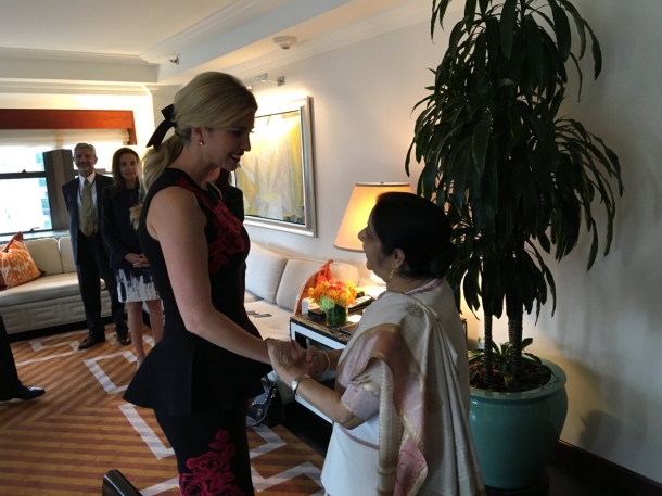 భారత విదేశాంగ శాఖ మంత్రి సుష్మా స్వరాజ్ పై అమెరికా అధ్యక్షుడు డొనాల్డ్ ట్రంప్ కుమార్తె ఇవాంకా ట్రంప్ ప్రశంసల జల్లు కురిపించారు. ట్రంప్ కు సలహాదారుగా వ్యవహరిస్తున్న ఇవాంకాతో సుష్మా న్యూయార్క్ లో భేటీ అయ్యారు. ఐక్యరాజ్యసమితి జనరల్ అసెంబ్లీ సమావేశానికి వీరిరువురూ హాజరయ్యారు. ఈ సందర్భంగా సుష్మాను ఇవాంకా కలిశారు. వీరిరువురూ వుమెన్స్ ఎంటర్ ప్రెన్యూర్ షిప్ తో పాటు ఇరు దేశాల్లో పారిశ్రామిక అభివృద్ధిపై చర్చించారు.
