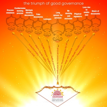 డిజిటల్ ఇండియాలో భాగంగా నరేంద్రమోదీ పాలనలో ప్రతి ఒక్క ప్రభుత్వ విభాగానికి ట్విట్టర్ అకౌంట్ ఉంది. అదేవిధంగా ఆధార్ కార్డులు జారీ చేసే యూఐడీఏఐకి కూడా ఉంది. విజయదశమి సందర్భంగా ఆధార్ ట్విట్టర్ హ్యాండిల్ ద్వారా యూఐడీఏఐ వారు శుభాకాంక్షలు తెలియజేశారు. రావణుడి పది తలలను ఆధార్ ద్వారా తీర్చుకోగల పది సమస్యలుగా చూపిస్తూ వారు ఒక ఫొటో పోస్ట్ చేశారు.