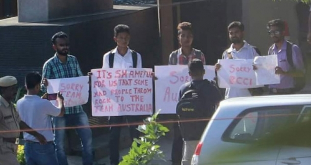 ఆసీస్ ఆటగాళ్లు బసచేసిన రాడిసన్ బ్లూ హోటల్ ముందు చేరిన వందలాది మంది యువతీ యవకులు క్షమాపణలు కోరుతూ ప్లకార్డులను ప్రదర్శించారు. తాము చేసిన పనికి సిగ్గుపడుతున్నామని, ఓ తుంటరి చేసిన పనికి, రాష్ట్ర యువతంతా క్షమించాలని వేడుకుంటోందని వారు తెలిపారు. కాగా, రాళ్లదాడిలో బస్సు అద్దాలు పగిలిన సంగతి తెలిసిందే.
