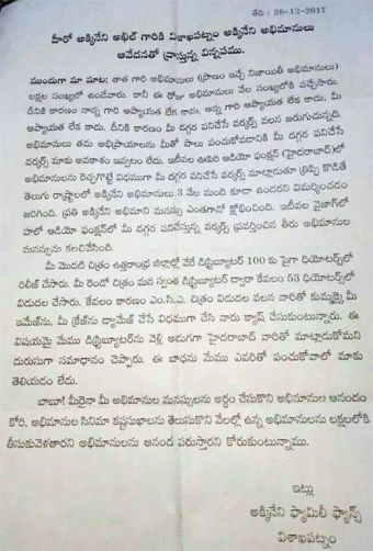 అఖిల్ తొలి చిత్రం ఉత్తరాంధ్ర జిల్లాల్లో 100 చోట్ల విడుదలైతే, ఇటీవలి 'హలో' 53 థియేటర్లకే పరిమితమైందని, అఖిల్ క్రేజ్ ను డ్యామేజ్ చేసేందుకు కొందరు పనిగట్టుకుని కూర్చున్నారని, తమ బాధ ఎవరితో పంచుకోవాలో తెలియడం లేదని వాపోయారు. మీరైనా అభిమానుల మనసులను అర్థం చేసుకోవాలని, పరిస్థితిని మార్చి చూపించాలని అఖిల్ ను వారు అభ్యర్థించారు. అక్కినేని ఫ్యామిలీ ఫ్యాన్స్ పేరిట విడుదలైన ఈ లేఖను మీరూ చూడవచ్చు.