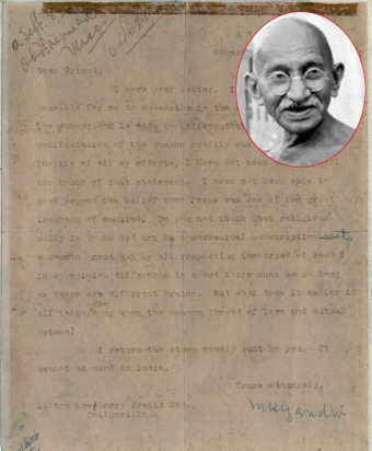 క్రీస్తు గురించి ప్రస్తావిస్తూ మహాత్మాగాంధీ రాసిన లేఖ వేలానికి వచ్చింది. పెన్సిల్వేనియాకు చెందిన రాబ్ కలెక్షన్ సేకరించిన ఈ లేఖను వేలం వేయనున్నారు. అమెరికాలోని క్రైస్తవ మత బోధకుల్లో ఒకరైన మిల్టన్ న్యూ బెర్రీ ఫ్రాంట్జ్కు ఏప్రిల్ 6, 1926న గాంధీ లేఖ రాశారు. ఇప్పుడీ లేఖకు వేలంలో 50 వేల డాలర్లు పలికే అవకాశం ఉందని చెబుతున్నారు.