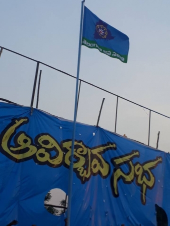 హైదరాబాద్లోని సరూర్నగర్ మైదానంలో తెలంగాణ జన సమితి పార్టీ ఆవిర్భావ సభ కొనసాగుతోంది. ఈ సభలో తెలంగాణ జన సమితి అధ్యక్షుడిగా కోదండరామ్ను ఆ పార్టీ నేతలు అంబటి శ్రీనివాస్, భిక్షపతి ప్రతిపాదించగా, అనంతరం పార్టీ అధ్యక్షుడిగా ఆయన ఎన్నికను నేతలు, కార్యకర్తలు ఆమోదించారు. ఈ సందర్భంగా తమ పార్టీ జెండాను కోదండరామ్ ఆవిష్కరించారు. ప్రజలు భారీగా తరలివచ్చిన ఈ సభలో ప్రొఫెసర్ హరగోపాల్ కూడా పాల్గొన్నారు. తెలంగాణ వచ్చిన తరువాత కూడా ప్రజల ఆకాంక్షలు నెరవేర్చలేదని టీఆర్ఎస్ సర్కారు తీరుని సభలో తెజస నేతలు ఎండగడుతున్నారు. కాగా, తెలంగాణ జన సమితికి 'తీన్మార్' మల్లన్న రూ.1,00,116 విరాళం ఇచ్చారు.