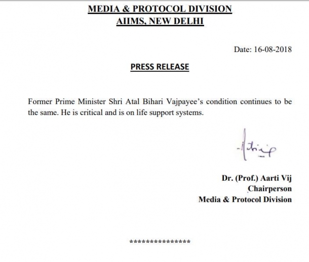 గడచిన కొన్ని వారాలుగా న్యూఢిల్లీలోని ఎయిమ్స్ లో తీవ్ర అనారోగ్యంతో చికిత్స పొందుతున్న మాజీ ప్రధాని అటల్ బిహారీ వాజ్ పేయి ఆరోగ్యంపై కొద్దిసేపటి క్రితం ఆసుపత్రి మీడియా అండ్ ప్రొటోకాల్ డివిజన్ చైర్ పర్సన్ డాక్టర్ అరిల్ విజు పేరిట హెల్త్ బులెటిన్ విడుదలైంది. "మాజీ ప్రధాని అటల్ బిహారీ వాజ్ పేయి ఆరోగ్యం విషమంగానే ఉంది. ప్రస్తుతం ఆయన్ను లైఫ్ సపోర్ట్ సిస్టమ్ పై ఉంచాం" అని పేర్కొన్నారు. మరోవైపు ఆయన్ను పరామర్శించేందుకు బీజేపీ అగ్రనేతలు ఆసుపత్రి ముందు క్యూ కట్టగా, వాజ్ పేయి అభిమానులు తీవ్ర ఆందోళనతో తమ ప్రియనేత కోలుకోవాలని పూజలు చేస్తున్నారు.