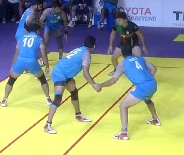 అయితే, డిఫెండింగ్ టెక్నిక్స్ తో ఇరాన్ ఆ స్కోరును 8-8 గా సమానం చేసింది. ఆ తర్వాత భారత ఆటగాళ్ళు 11-9తో ఒకడుగు ముందుకు వేస్తే ఇరాన్ ఆటగాళ్ళు 14-11తో ఆధిక్యంతో వరుసగా మూడు పాయింట్లు దక్కించుకున్నారు. ఇక అక్కడ నుండి విజృంభించిన ఇరాన్ ఆటగాళ్ళు 16-12, 20-14 తో సాగి, చివరకు 27-17తో ఆలౌట్ చేసి విజయం సాధించారు. దీంతో భారత్ పురుషుల కబడ్డీ జట్టు నిరాశతో వెనుదిరిగింది.