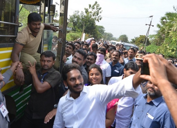వైఎస్ఆర్ కాంగ్రెస్ పార్టీ అధినేత వైఎస్ జగన్ మోహన్ రెడ్డి, 300 రోజుల క్రితం ప్రారంభించిన ప్రజా సంకల్పయాత్ర, ప్రస్తుతం విజయనగరం జిల్లా కురుపాం నియోజకవర్గంలో సాగుతున్న వేళ, ఓ ఆసక్తికర ఘటన జరిగింది. జగన్ పాదయాత్ర మార్గంలో వస్తున్న ఓ ఆర్టీసీ బస్సు డ్రైవర్, జగన్ ను చూసిన ఆనందంలో సెల్ఫీ దిగాలని ఉందని కోరాడు. అతని కోరికను తీర్చాలని నిర్ణయించుకున్న జగన్, డ్రైవర్ సెల్ ఫోన్ ను అడిగి తీసుకుని అతనితో సెల్ఫీ దిగాడు. దీంతో ఆ డ్రైవర్ ముఖం ఆనందంతో వెలిగిపోగా, ఈ దృశ్యాన్ని పాదయాత్రను చిత్రీకరిస్తున్న కెమెరాలు బంధించాయి.