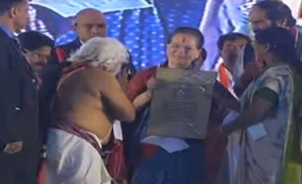 తెలంగాణ రాష్ట్రం ఏర్పడిన తర్వాత యూపీఏ ఛైర్ పర్సన్ సోనియాగాంధీ తొలిసారి రాష్ట్రానికి విచ్చేశారు. ఈ సందర్భంగా మేడ్చల్ సభలో ఆమెకు కాంగ్రెస్ నేతలు ఘన సన్మానం చేశారు. ఈ సందర్భంగా ఆమెకు టీటీడీపీ అధ్యక్షుడు ఎల్.రమణ, టీజేఎస్ అధినేత కోదండరామ్, ప్రజాగాయకుడు గద్దర్ తదితరులు అభినందనలు తెలిపారు. సోనియాకు గద్దర్ సతీమణి చీరను బహూకరించారు. అనంతరం గద్దర్ మాట్లాడుతూ, తెలంగాణను ఇచ్చిన సోనియాతల్లికి వందనమని చెప్పారు. తెలంగాణ పసిబిడ్డకు పాలు పట్టకుండా టీఆర్ఎస్ పాలకులు జోలపాట పాడారని విమర్శించారు. తెలంగాణ పసిబిడ్డను తన ఒడిలోకి తీసుకొని దీవించడానికి సోనియాతల్లి వచ్చారని చెప్పారు. 'పొడుస్తున్న పొద్దుమీద.. నడుస్తున్న కాలమా.. పోరు తెలంగాణమా' అనే పాటను పాడారు. మరోవైపు, కాసేపట్లో రాహుల్ గాంధీ సభావేదిక వద్దకు చేరుకోనున్నారు.