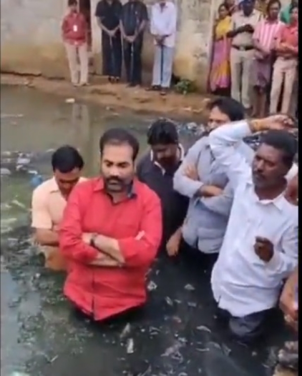 ప్రజలు పడుతున్న ఇబ్బందిపై అధికారులకు ఎన్నిసార్లు ఫిర్యాదు చేసినా పట్టించుకోకపోవడంతో వైసీపీ ఎమ్మెల్యే కోటంరెడ్డి శ్రీధర్ రెడ్డి వినూత్నంగా నిరసన తెలిపారు. స్థానికంగా చిన్న వంతెన నిర్మించాలని కోరుతున్నప్పటికీ అధికారులు స్పందించకపోవడంతో మురుగునీటి కాలువలోకి దిగిపోయారు. అధికారులు ఇక్కడ బ్రిడ్జిని నిర్మించేవరకూ తాను బయటకు రాబోనని స్పష్టం చేశారు. ఈ ఘటన నెల్లూరులో చోటుచేసుకుంది.