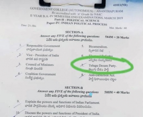 అనంతపురం ఆర్ట్స్ కాలేజీలో బీఏ చదువుతున్న విద్యార్థులు పరీక్షలు రాస్తుండగా, పొలిటికల్ సైన్స్ లో తెలుగుదేశం పార్టీ గురించి రాయాలన్న ప్రశ్న ఇవ్వడంతో పరీక్షకు హాజరైన వారు ఖంగుతిన్నారు. అటానమస్ హోదా ఉన్న ఈ కాలేజీ సొంతంగా ప్రశ్నాపత్రాలు తయారు చేసుకుంటుంది. బీఏ సెకండ్ ఇయర్, నాలుగో సెమిస్టర్ ప్రశ్నాపత్రంలో ఎనిమిది అంశాలను ఇస్తూ, అందులో ఏవైనా ఐదు ప్రశ్నలకు సమాధానం రాయాలని చెబుతూ, ఒక్కో ప్రశ్నకు 4 మార్కులను ఇచ్చింది వర్శిటీ.