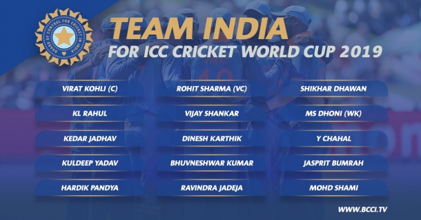 ఇంగ్లండ్ లో జరగనున్న ప్రపంచకప్ క్రికెట్ లో ఆడబోయే టీమ్ ను బీసీసీఐ ప్రకటించింది. 15 మందితో కూడిన జట్టులో విరాట్ కోహ్లీ (కెప్టెన్), రోహిత్ శర్మ (వైస్ కెప్టెన్), శిఖర్ ధావన్, కేఎల్ రాహుల్, విజయ్ శంకర్, ధోనీ (వికెట్ కీపర్), కేదార్ జాధవ్, దినేశ్ కార్తీక్ (సెకండరీ వికెట్ కీపర్), యజువేంద్ర చాహల్, కుల్దీప్ యాదవ్, భువనేశ్వర్ కుమార్, జస్ప్రీత్ బుమ్రా, హార్దిక్ పాండ్యా, రవీంద్ర జడేజా, మొహమ్మద్ షమీలు ఉన్నారు.