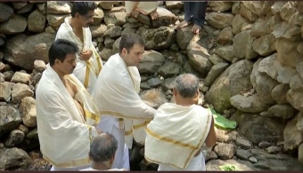 కాంగ్రెస్ పార్టీ అధినేత రాహుల్ గాంధీ కేరళలోని వాయనాడ్ నుంచి కూడా లోక్ సభకు పోటీచేస్తున్న సంగతి తెలిసిందే. ఇవాళ కేరళలో ఎన్నికల ప్రచారం నిర్వహిస్తున్న రాహుల్ బ్రహ్మగిరి పర్వతాల్లో ప్రత్యేక పూజలు నిర్వహించారు. ప్రఖ్యాతిగాంచిన తిరునెల్లి ఆలయం వద్దకు ఆయన కాలినడకన వెళ్లారు. సంప్రదాయ దుస్తుల్లో ఉన్న రాహుల్ రాళ్ల గుట్టలను కూడా లెక్కచేయకుండా పాదరక్షలు లేకుండా నడచి వెళ్లి పాపనాశని నదీతీరంలో ఉన్న తిరునెల్లి ఆలయాన్ని సందర్శించారు. ఈ సందర్భంగా అక్కడ వేదపండితుల సమక్షంలో శాస్త్రోక్తంగా 'బలి తర్పణం' పూజల్లో పాల్గొన్నారు. ఈ 'బలి తర్పణం' పూజలు ఏడు తరాల పూర్వీకుల ఆత్మశాంతి కోసం ఉద్దేశించి నిర్వహిస్తారు.