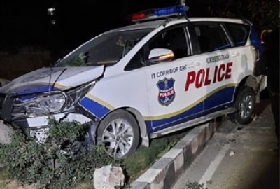 పెట్రోలింగ్ నిమిత్తం వెళుతున్న పోలీసు కారు, అదుపుతప్పి, డివైడర్ ను ఢీకొంది. ఈ ఘటన హైదరాబాద్, గచ్చిబౌలిలో జరిగింది. అతివేగమే ఈ ప్రమాదానికి కారణమని తెలుస్తోంది. ఈ ప్రమాదంలో వాహనంలోని ఇద్దరు కానిస్టేబుళ్లకు గాయాలు కాగా, వారిని ఆసుపత్రికి తరలించారు. విషయం తెలుసుకున్న గచ్చిబౌలి పోలీసులు, క్రేన్ సాయంతో వాహనాన్ని డివైడర్ నుంచి తొలగించి, తీసుకెళ్లారు. కేసు నమోదు చేసి దర్యాఫ్తు చేస్తున్నామని తెలిపారు.