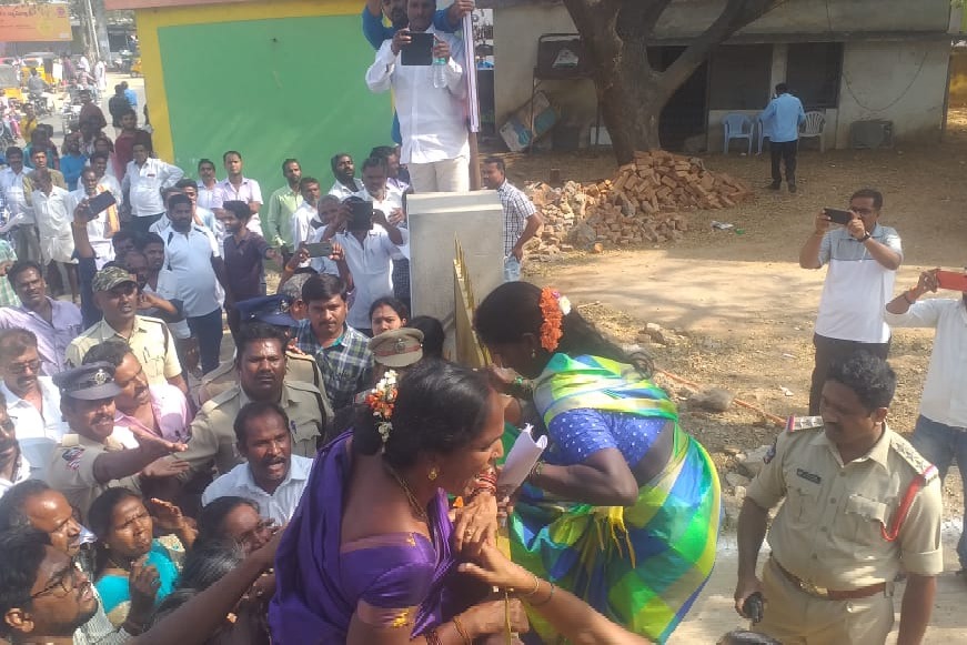 'పోలీసులు తెలుగు దేశంపార్టీ అభ్యర్థులను నామినేషన్ వేసేందుకు అనుమతించకపోవడంతో ఎంపీటీసీ అభ్యర్థిగా నామినేషన్ వేసేందుకు వచ్చిన మహిళా అభ్యర్థులు ఇలా గేట్లెక్కి లోనికి వెళ్లాల్సి వచ్చింది' అని తెలిపింది. గేట్లు మూసేసి ఉండడంతో కొందరు మహిళలు గేట్లు ఎక్కడం ఈ ఫొటోల్లో కనపడుతోంది.