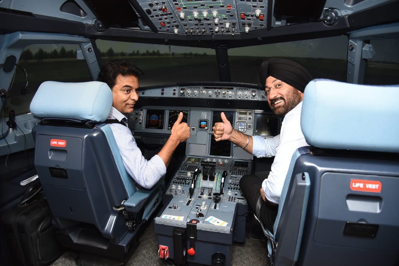 మంత్రి కేటీఆర్ ఈ ఫ్లైట్ సిమ్యులేటర్ లో కూర్చుని తాను కూడా మీటలు నొక్కుతూ నిజంగానే విమానం నడిపిన అనుభూతి సొంతం చేసుకున్నారు. కాక్ పిట్ లో ఉన్న పైలెట్ మంత్రి కేటీఆర్ కు సూచనలు ఇస్తూ ఆయనతో విమానం ఇంజిన్ ను ఆపరేట్ చేయించారు.