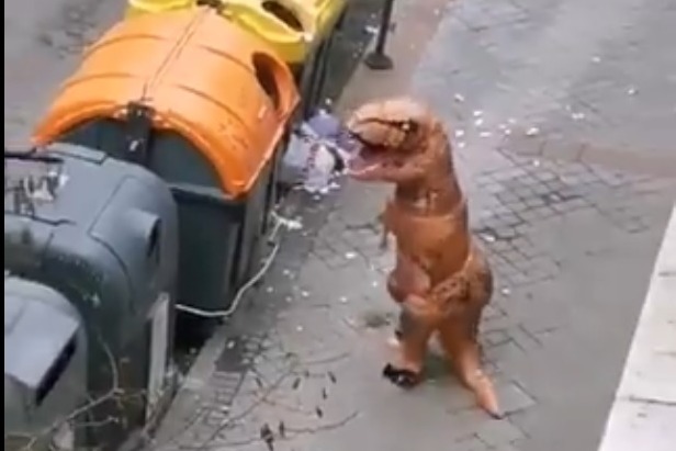 కరోనా వైరస్ వ్యాప్తి బాగా పెరగడంతో స్పెయిన్ లోని చాలా ప్రాంతాలను పూర్తిగా లాక్ డౌన్ చేశారు. అలా నిషేధం ఉన్న ముసిరా పట్టణంలో ఈ వ్యక్తి నారింజ రంగులో ఉన్న ‘టైనోసరస్ రెక్స్’ తరహా డైనోసార్ కాస్ట్యూమ్స్ వేసుకుని రోడ్డు మీదికి వచ్చాడు. నిజానికి వచ్చింది చెత్తను డస్ట్ బిన్ లో పడేయడానికి.. కానీ పడేశాక వీధుల్లో తిరగడం మొదలుపెట్టాడు. అది చూసిన పోలీసులు.. అలా తిరగొద్దని హెచ్చరించి పంపేశారు. ఇదంతా ఆ వీధుల్లోని సీసీ కెమెరాల్లో రికార్డయింది.డైనోసార్లు వచ్చినా అంతేనట..