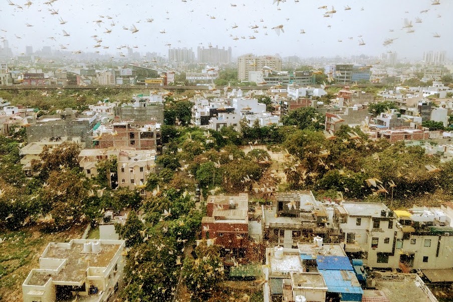 దేశ రాజధాని ఢిల్లీ సమీపంలోని ప్రముఖ పారిశ్రామిక, వాణిజ్య ప్రాంతం గురుగ్రామ్ పై రాకాసి మిడతలు దండెత్తాయి. రాజస్థాన్, మధ్యప్రదేశ్ తదితర ప్రాంతాల నుంచి వచ్చిన ఈ మిడతల దండు గురుగ్రామ్ లోని ఐటీ కంపెనీలు, ఇతర కార్యాలయాల్లో చొరబడ్డాయి. మెట్రో స్టేషన్లలోనూ మిడతలు పెద్ద ఎత్తున ప్రవేశించాయి. ఆకాశం నుంచి ఊడిపడ్డాయా అన్నట్టుగా వచ్చిన వీటిని చూసి గురుగ్రామ్ వాసులు హడలిపోతున్నారు. మరోపక్క, అధికారులు రాజధాని ప్రజలను అప్రమత్తం చేశారు. ఇళ్ల తలుపులు, కిటికీలు మూసివేయాలని, పెద్దగా చప్పుడు చేయాలని సూచించారు. ఇవి క్రమంగా ఢిల్లీ వైపు పయనిస్తున్నట్టు అధికారులు గుర్తించారు. ముందుజాగ్రత్తగా, ఢిల్లీ విమానాశ్రయంలో అధికారులు పైలెట్లకు మిడతల కదలికలపై అవగాహన కల్పించారు.
