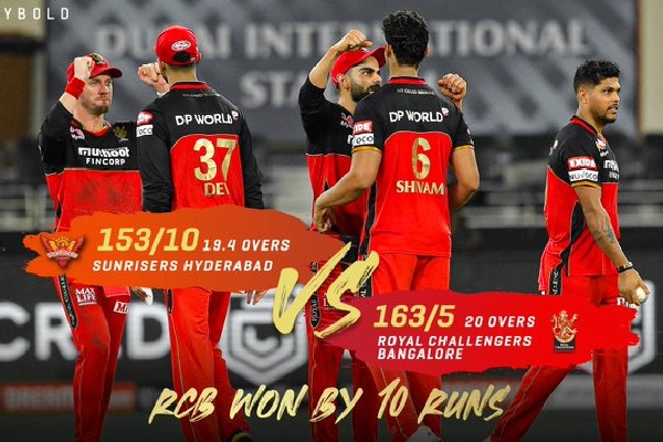 ఐపీఎల్లో భాగంగా నిన్న దుబాయ్లో హైదరాబాద్ సన్ రైజర్స్, రాయల్ చాలెంజర్స్ బెంగళూరు మధ్య జరిగిన ఐపీఎల్ మూడో మ్యాచ్లో బెంగళూరు 10 పరుగుల తేడాతో విజయం సాధించింది. ఈ మ్యాచ్లో తొలుత టాస్ ఓడి బ్యాటింగ్కు దిగిన ఆర్సీబీ నిర్ణీత 20 ఓవర్లలో 5 వికెట్ల నష్టానికి 163 పరుగులు చేసింది.