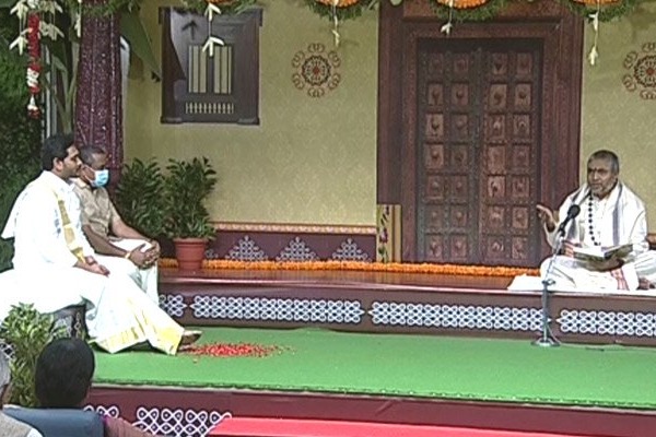 ఏపీ ముఖ్యమంత్రి జగన్ ఉగాది పండుగ వేడుకల్లో పాల్గొన్నారు. తాడేపల్లిలోని సీఎం క్యాంపు కార్యాలయంలో ఈరోజు ప్లవ నామ సంవత్సర ఉగాది వేడుకలు జరిగాయి. వేద పండితులు పంచాంగ శ్రవణం నిర్వహించారు. అనంతరం ముఖ్యమంత్రిని వేద పండితులు సత్కరించి, ఉగాది పచ్చడిని అందించారు. ఈ కార్యక్రమంలో దేవాదాయశాఖ మంత్రి వెల్లంపల్లి శ్రీనివాసరావు, యార్లగడ్డ లక్ష్మీప్రసాద్ తదితరులు పాల్గొన్నారు.