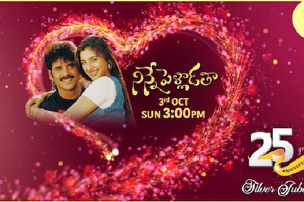ప్రెస్ నోట్: "నిన్నే పెళ్లాడతా"... ప్రతి తెలుగు ఇంటిలో ఎప్పటికీ గుర్తుండిపోయే సినిమా. రెండు కుటుంబాలు; శీను, పండు అనే ఇద్దరు పంచుకున్న జ్ఞాపకాల ఆల్బమ్ లాంటి సినిమా. ఇప్పుడు ఈ సినిమా 25 సంవత్సరాలు పూర్తిచేసుకున్న సందర్భాన్ని స్టార్ మా ఎన్నో విశేషాలతో సెలెబ్రేట్ చేస్తోంది. ఎవర్ గ్రీన్ ఫామిలీ ఎంటర్ టైనర్ అని, ప్రేమ కావ్యం అని ప్రతి ప్రేక్షకుడు ఆస్వాదించిన ఈ సినిమాలో ప్రేమ జంటగా నాగార్జున, టబు ల మాజికల్ మూమెంట్స్ గురించి ఎంత మాట్లాడుకున్నా తక్కువే.