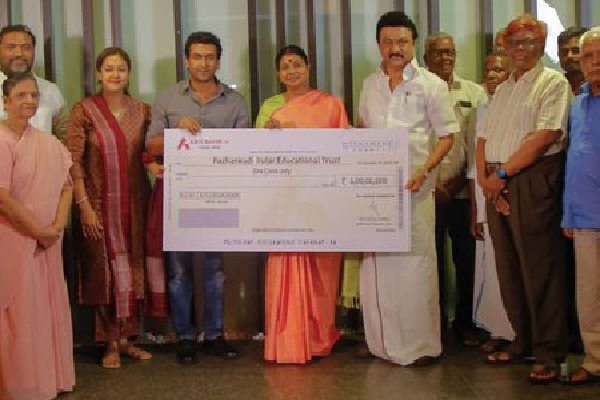 తమిళ స్టార్ హీరో సూర్య అగరం ఫౌండేషన్ స్థాపించి అనేక రూపాల్లో సామాజిక సేవ చేస్తున్నారు. తాజాగా, సూర్య తమిళనాడు సీఎం స్టాలిన్ కు రూ.1 కోటి విరాళం అందించారు. నేడు సూర్య, జ్యోతిక దంపతులు సీఎం స్టాలిన్ ను కలిసి తమ 2డీ ఎంటర్టయిన్ మెంట్ బ్యానర్ తరఫున చెక్ ను అందించారు. ఆ కోటి రూపాయల మొత్తాన్ని ఇరులర్ గిరిజన తెగ ప్రజల సంక్షేమం కోసం వినియోగించాలని సీఎంను కోరారు. ఇరులర్ తెగ విద్యార్థులకు ఉపయోగపడేలా ఆ నిధులను ఖర్చు చేయాలని సూర్య, జ్యోతిక విజ్ఞప్తి చేశారు. ఈ కార్యక్రమంలో విశ్రాంత జస్టిస్ చంద్రు, పళంగుడి ఇరులర్ ట్రస్టు సభ్యులు కూడా పాల్గొన్నారు.